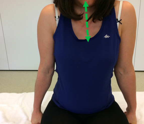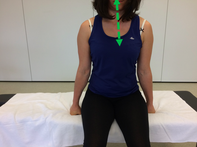Le patient garde ses pieds au sol et se soulève en sortant la tête des épaules. Puis dans un deuxième temps il enfonce sa tête dans ses épaules tout en gardant les bras tendus.