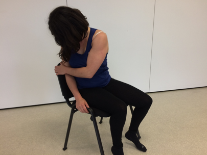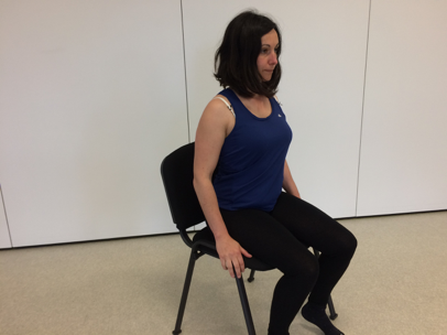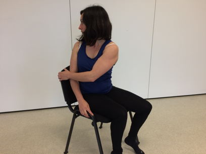 Il se tourne à l’opposé de la côte douloureuse. Il attrape le dossier de la chaise et le maintient. Il peut aussi le faire en voiture en attrapant la base de la ceinture de sécurité.